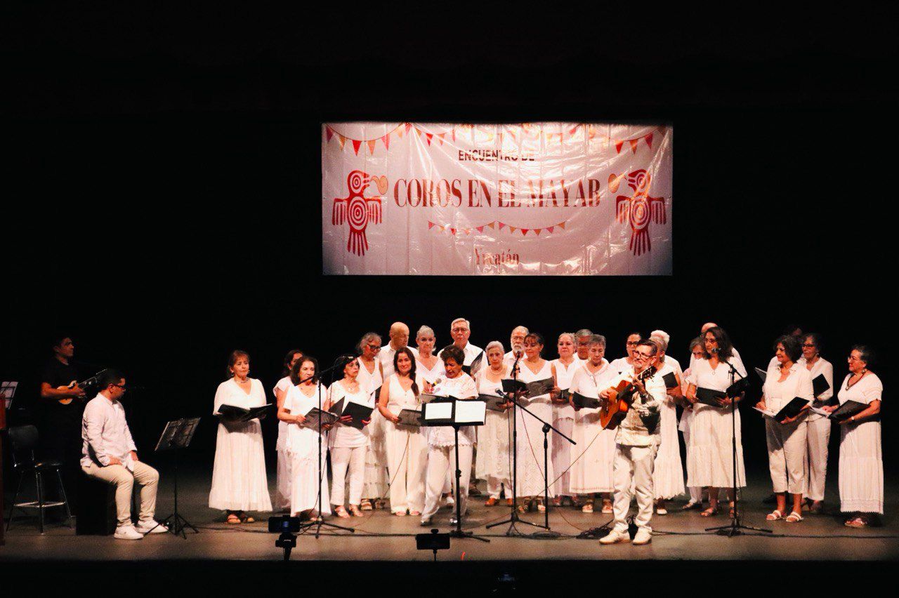 El teatro Daniel Ayala Pérez resonó con el concierto de clausura del 2º Encuentro de Coros en el Mayab, que contó con la participación de más de 150 voces de diferentes partes del país que, al unísono, cerraron las actividades del festival.