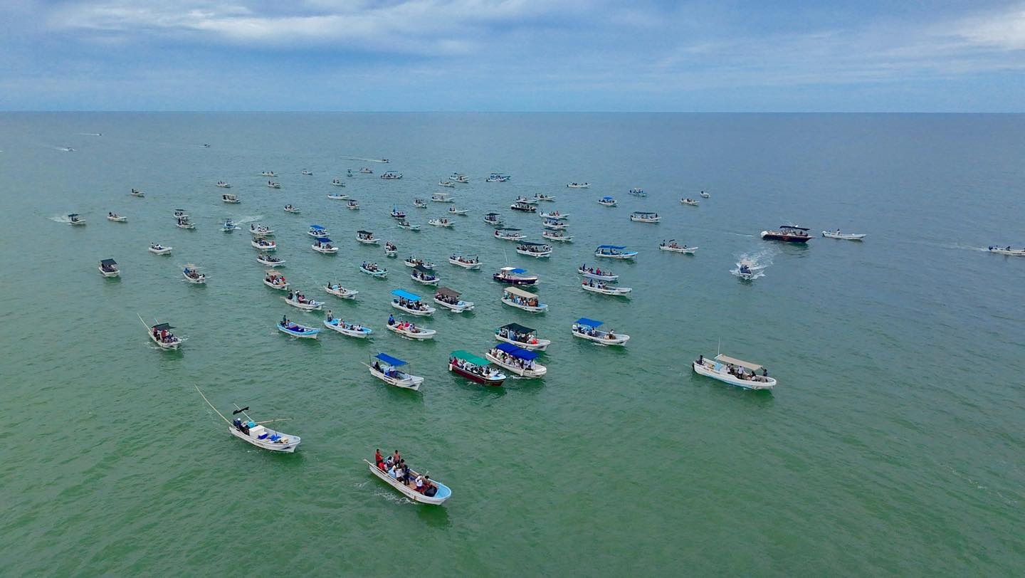 De visita al puerto de El Cuyo, el alcalde Adrián Quiroz Osorio acompañó a poco más de 150 embarcaciones y familias que se sumaron al tradicional bordeo y procesión en honor a la Virgen de la Merced, patrona de este puerto tizimileño.