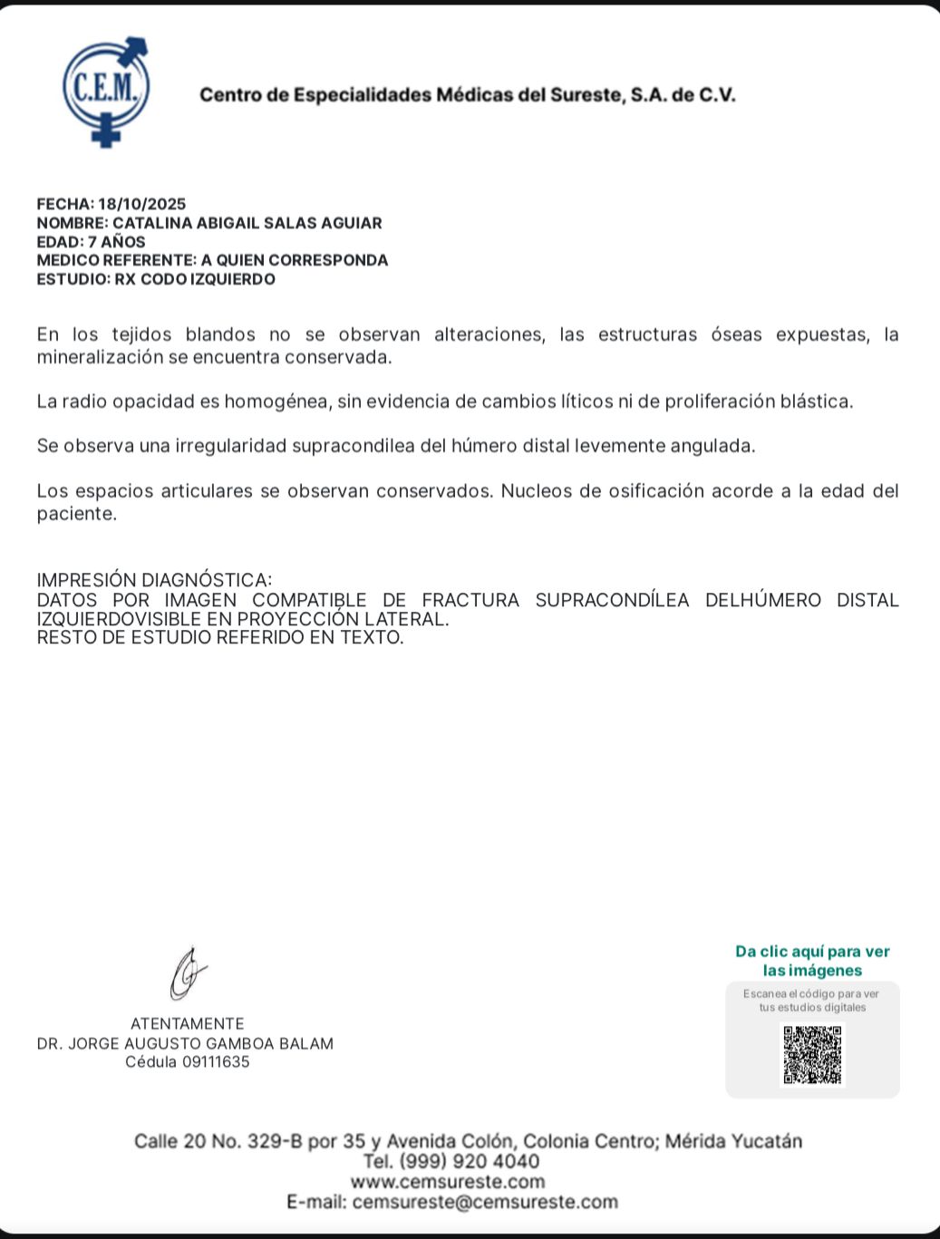 Su hijo tuvo fisura, por lo que fue necesaria una intervención quirúrgica con la colocación de tres clavos en la parte lesionada. Estará hospitalizada hasta su recuperación, por lo que Isidro y su familia pusieron en la Fiscalía General de Yucatán una denuncia para alertar a padres de familia que este lugar, a pesar de ser un establecimiento de diversión extrema, no cuenta con personal calificado, material y primeros auxilios.
