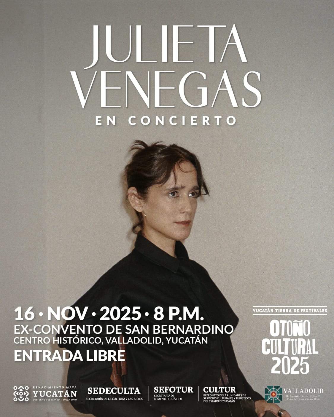 La cantautora mexicana Julieta Venegas ofrecerá un concierto gratuito en el Atrio del Convento de San Bernardino de Siena, en Valladolid, el próximo 16 de noviembre, a las 20:00.