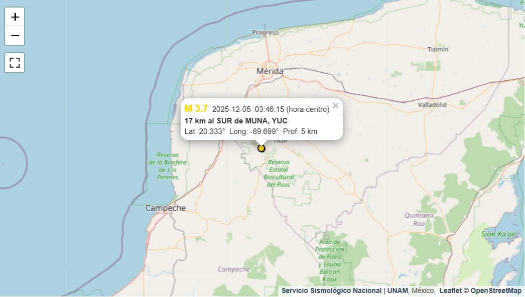 Este es el segundo registro que se tiene en el año, pues el pasado 9 de octubre, a las 23:28 horas, ocurrió un temblor de magnitud 3.8, con epicentro en Yucatán, a 13 kilómetros al noreste de Ticul.