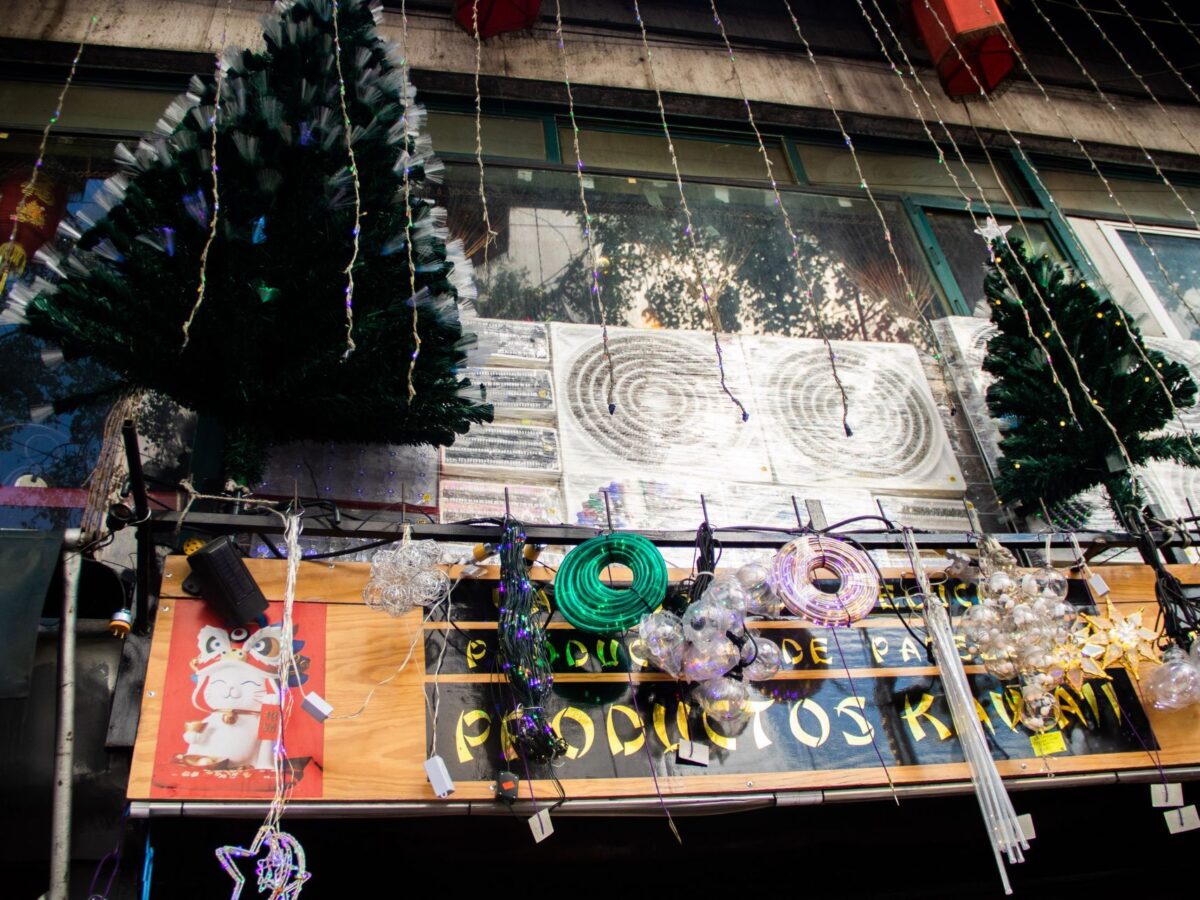 Árboles de Navidad y series de luces en las tiendas del Barrio Chino.