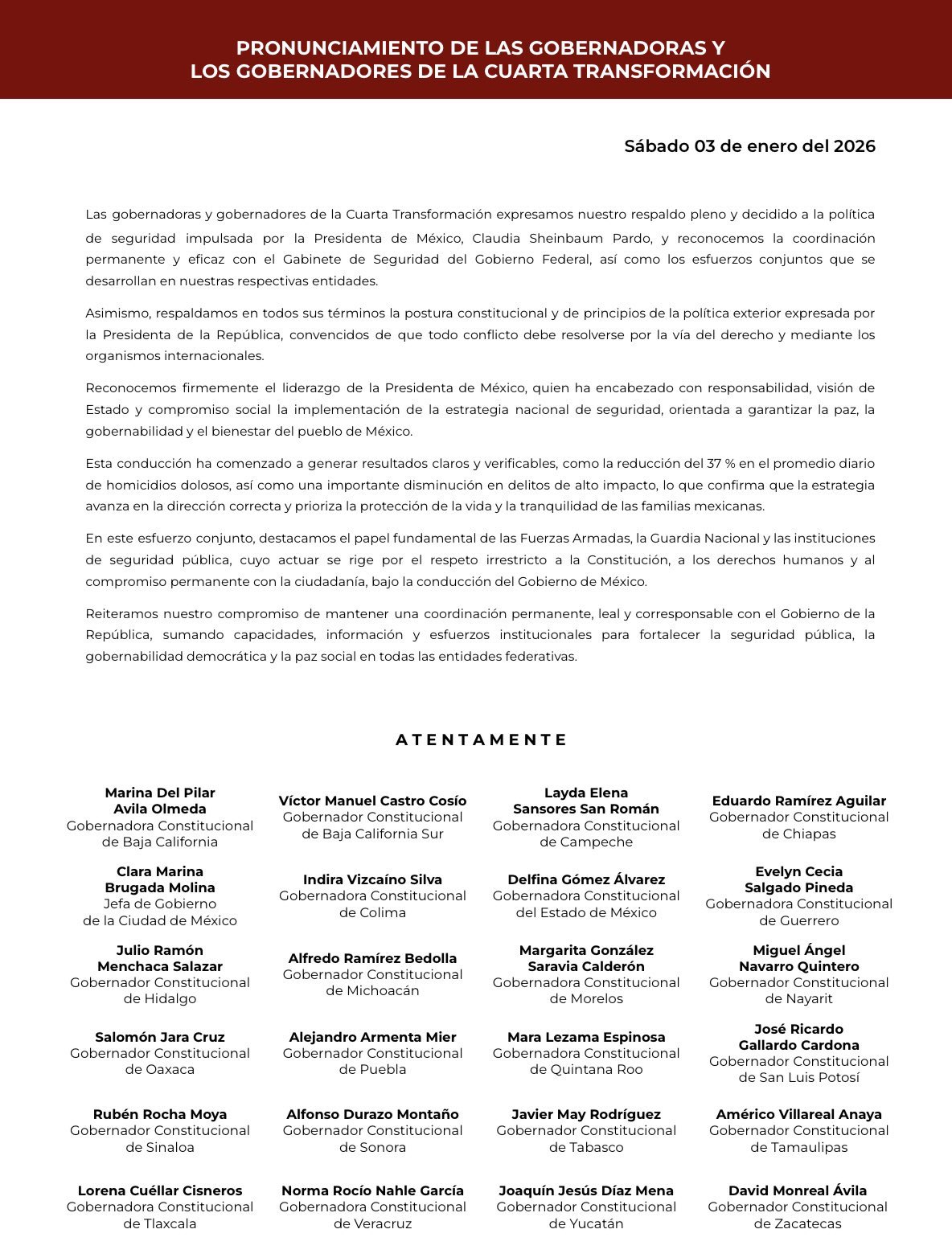 El mandatario compartió en sus redes sociales imagen del manifiesto, y posteó: “Las gobernadoras y gobernadores de la Cuarta Transformación expresamos nuestro respaldo pleno y decidido a la política de seguridad impulsada por la presidenta @Claudiashein, y reconocemos la coordinación permanente y eficaz con el Gabinete de Seguridad del Gobierno Federal, así como los esfuerzos conjuntos que se desarrollan en nuestras respectivas entidades”.